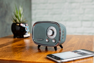 Crosley Rondo Bluetooth Speaker, Tourmaline-$33.99 -The tiny but mighty rondo bluetooth speaker from crosley brings on the retro space-age vibes. side controls allow you to wirelessly accept calls, adjust volume and skip tracks while usb, mini sd and charging ports are housed in the back of the unit. faux chrome trim and tapered legs enhance the rondo's mid-century modern silhouette. Crosley